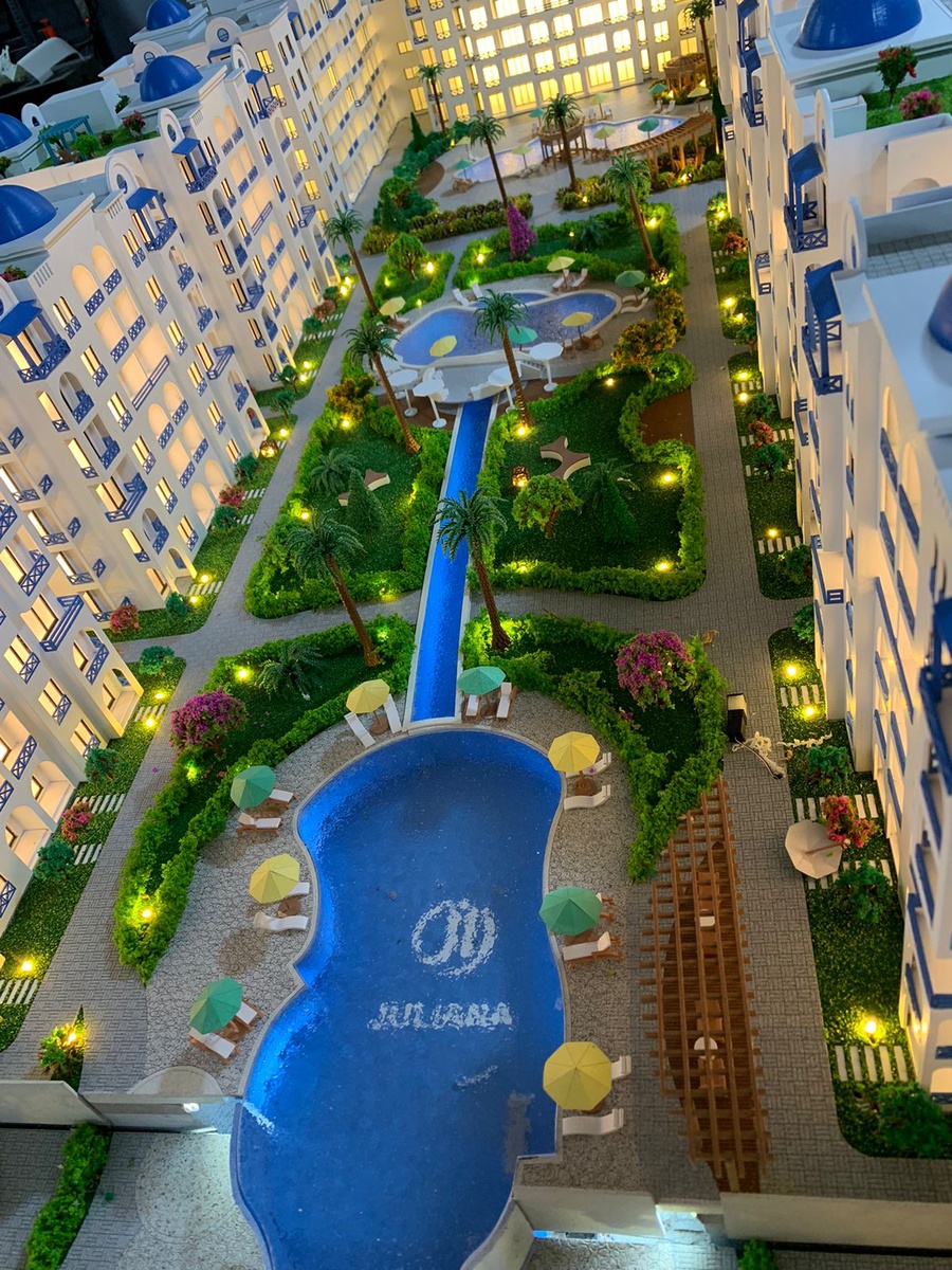 يعرض الماكيت نموذجًا معماريًا متكاملًا لمجمع سكني فاخر بتصميم مستوحى من الطراز المتوسطي، حيث تتميز المباني باللون الأبيض مع الشرفات والتفاصيل المعمارية الزرقاء والقباب أعلى الأسطح، مما يمنح المشروع طابعًا مميزًا يجمع بين الفخامة والبساطة.