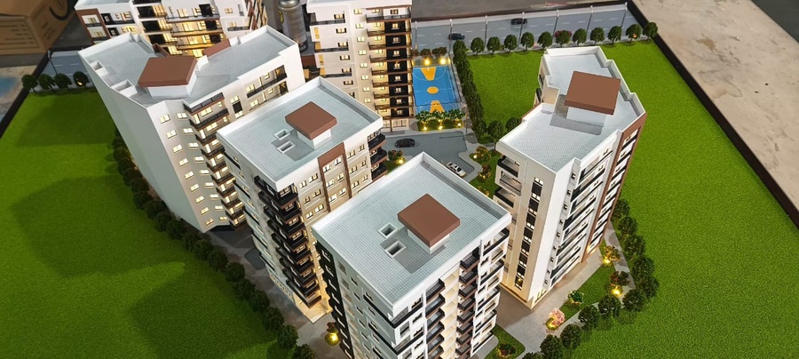 نموذج معماري مصغر لمجمع سكني حديث يتكون من عدة أبراج سكنية، ويستخدم لعرض فكرة التصميم العام للمشروع وتوزيع المباني والخدمات قبل التنفيذ الفعلي.