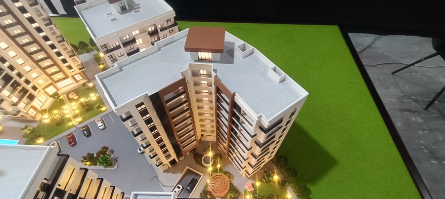 نموذج معماري مصغر لمبنى سكني حديث ضمن مجمع عمراني متكامل، ويُستخدم لعرض التصميم المعماري للمشروع وتوضيح توزيع المباني والخدمات قبل التنفيذ الفعلي.