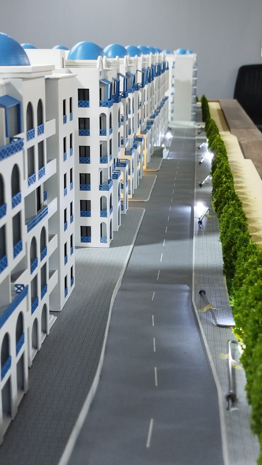 يعرض الماكيت نموذجًا معماريًا لمجمع سكني حديث بتصميم مستوحى من الطراز المتوسطي، حيث تتميز المباني باللون الأبيض مع شرفات وتفاصيل معمارية باللون الأزرق، إضافة إلى القباب الزرقاء أعلى المباني التي تضفي طابعًا مميزًا وأنيقًا على المشروع.