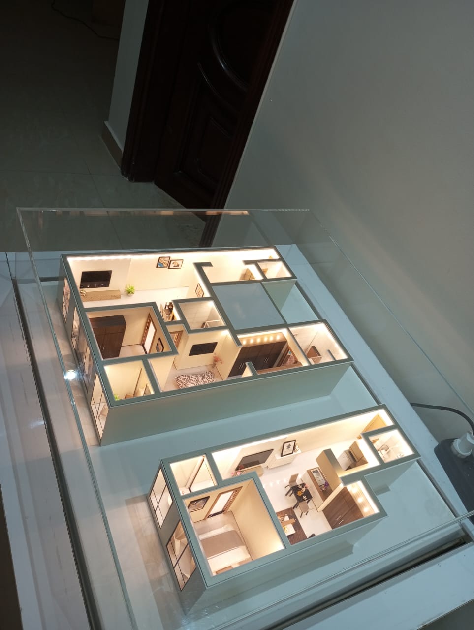 - الماكيت يعرض مخططين لوحدتين سكنيتين داخل صندوق زجاجي للحفاظ عليه وإظهار التفاصيل بوضوح.