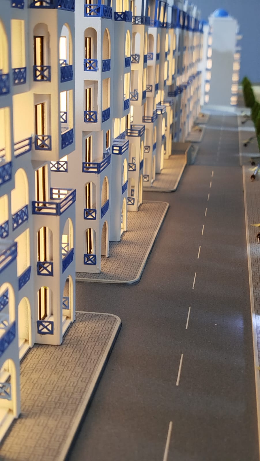 - يوجد إضاءة داخلية للمباني تظهر من النوافذ، مما يعطي إحساسًا بالحياة داخل المبنى ويجعل الماكيت يبدو واقعيًا خاصة عند العرض.