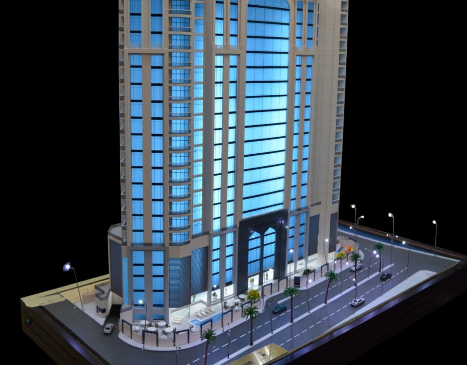 ماكيت برج بتصميم معماري عصري يعكس قوة المشروع وهيبته، مع واجهات زجاجية بانورامية تمنح إحساس بالاتساع والحداثة.