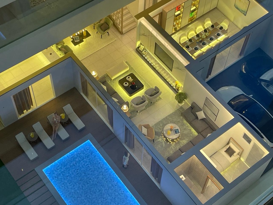 نموذج معماري مصغر لتصميم فيلا أو شقة فاخرة مع مسبح خاص، ويعرض توزيع الفراغات الداخلية والخارجية للمسكن بشكل واضح لإظهار فكرة التصميم المعماري والديكور الداخلي قبل التنفيذ.
