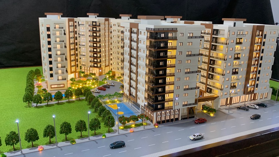 نموذج معماري مصغر لمجمع سكني حديث يتكون من عدة عمارات سكنية متوسطة الارتفاع، ويهدف إلى عرض فكرة المشروع وتوضيح توزيع المباني والخدمات والمرافق داخل الموقع قبل التنفيذ الفعلي.