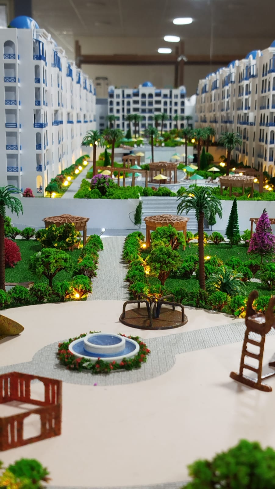 الماكيت يعرض نموذجًا معماريًا لمجمع سكني حديث بتصميم مستوحى من الطراز المتوسطي، حيث تتميز المباني باللون الأبيض مع تفاصيل وشرفات باللون الأزرق وقباب أعلى المباني، مما يمنح المشروع طابعًا معماريًا مميزًا وأنيقًا.